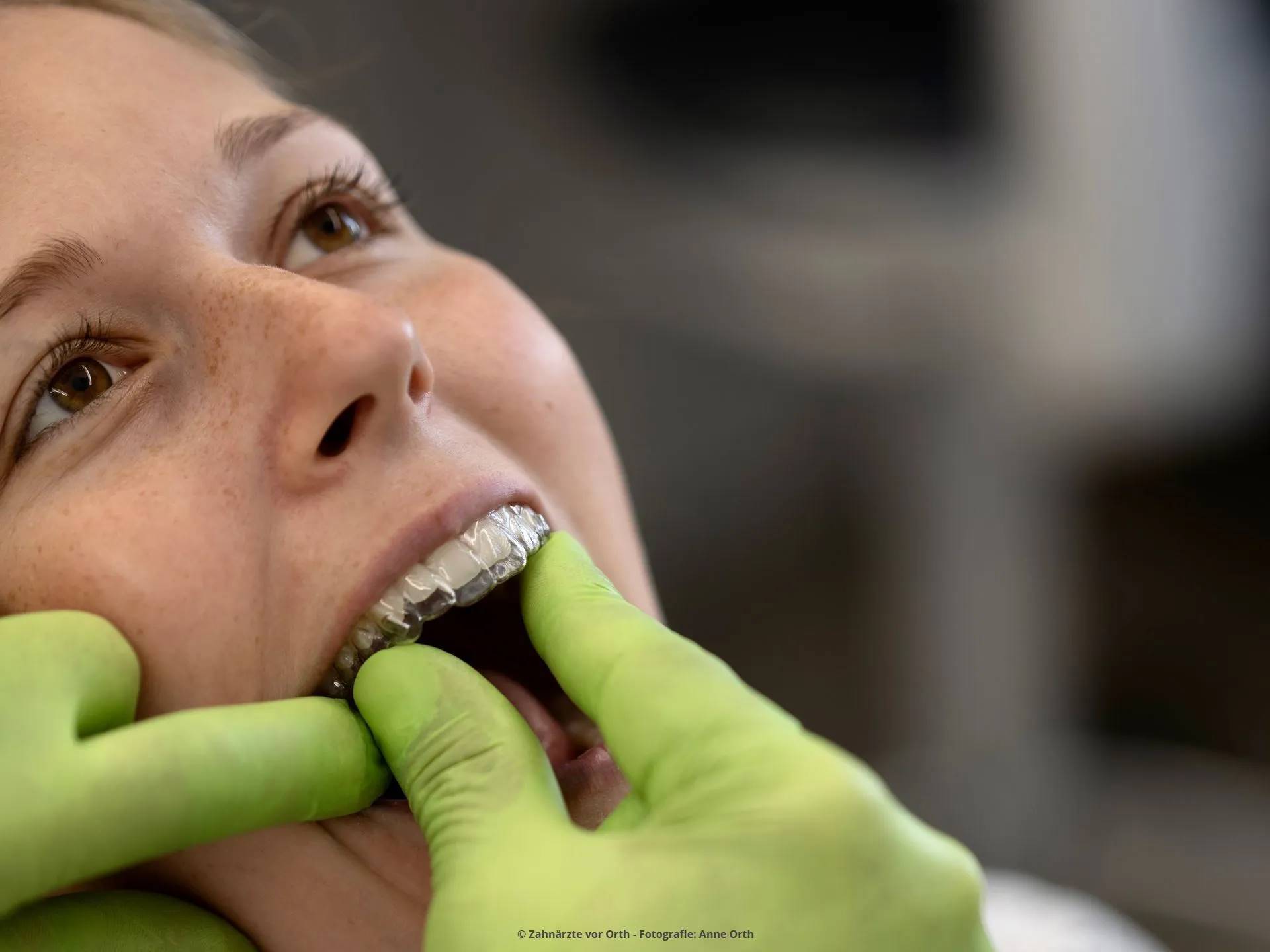 Bei der Alignertherapie werden Zahnfehlstellungen mit transparenten Schienen korrigiert.